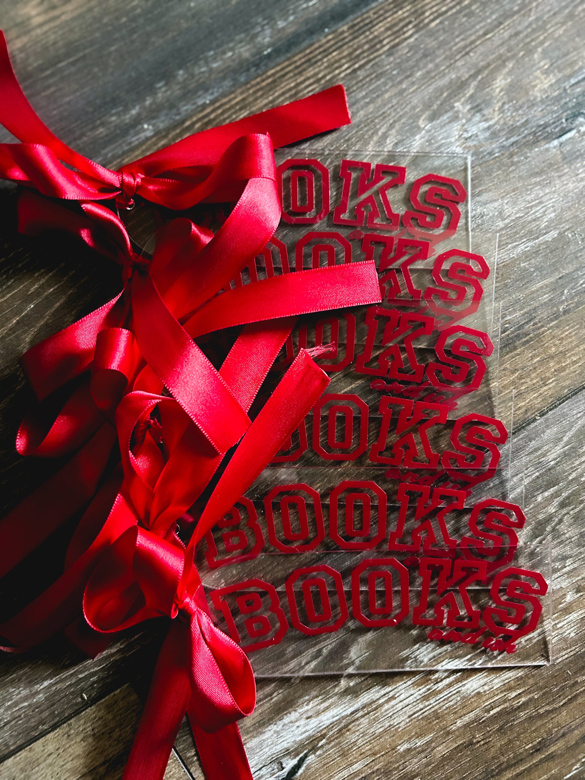 The red vinyl and satin ribbon make these acrylic bookmarks beautiful and encouraging. What other way to encourage more reading than to make it fashionable!